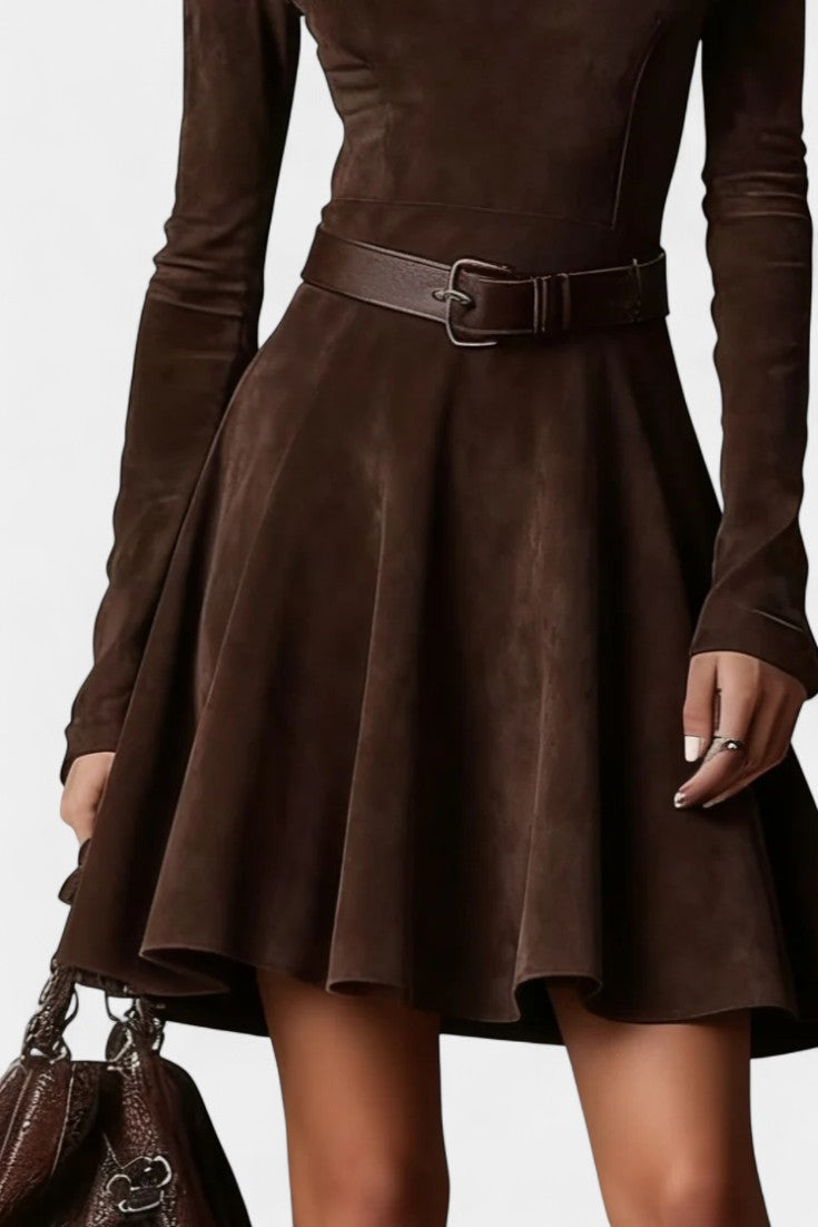 Marlyène évoque le charme rétro avec une touche contemporaine. Confectionnée en suède doux, cette robe mini allie confort et style grâce à son col montant élégant et sa coupe cintrée à la taille. Sa silhouette courte apporte une note ludique et féminine, idéale pour les journées d’automne ou les soirées décontractées.