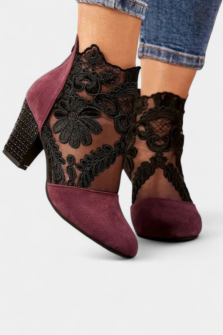 Un design qui allie sophistication et charme artisanal dans chaque détail. Les talons Alaine se distinguent par une délicate dentelle florale faite à la main qui apporte une touche romantique et intemporelle. Leur semelle rembourrée et le talon stable garantissent un confort tout au long de la journée, en faisant le choix parfait pour les mariages, les événements élégants ou les soirées spéciales.