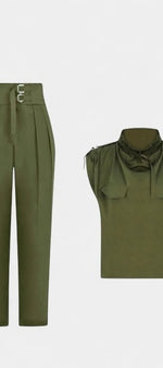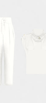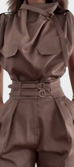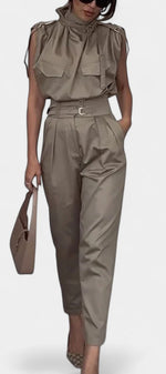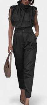 La combinaison Cassis présente un col montant avec un détail froncé, des poches avant à rabat et une silhouette droite qui est mise en valeur par la ceinture ajustée à la taille. Sa coupe raffinée et polyvalente en fait une pièce clé pour un style soigné qui passe facilement du jour à la nuit.