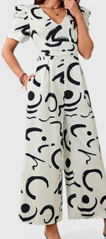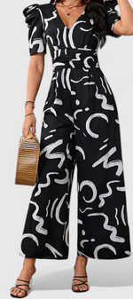 Zawadi Combinaison à Imprimé Abstrait avec Manches Bouffantes et Jambes Larges