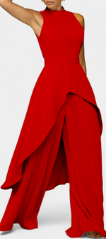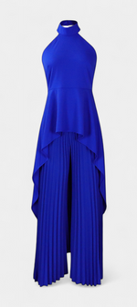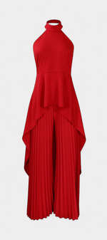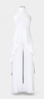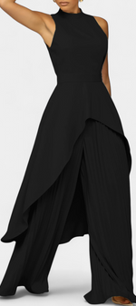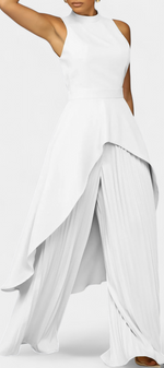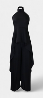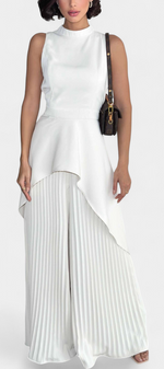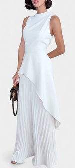 Minimalisme élégant avec une silhouette qui s'écoule avec distinction. L'ensemble Chrysoula combine un top sans manches à col fermé avec un design asymétrique enveloppant et un pantalon plissé à large tombé. Le contraste entre la structure du haut et la légèreté du pantalon crée une présence sophistiquée et contemporaine.