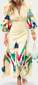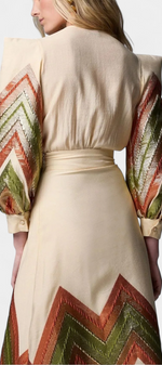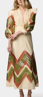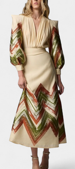 Une proposition audacieuse qui fusionne modernité et élégance intemporelle. Avenza se distingue par un motif géométrique en chevron dans des tons terreux qui apporte force visuelle et distinction. Le body intègre des manches bouffantes avec des épaulettes structurées et un décolleté en V profond qui équilibre puissance et féminité. La jupe midi coordonnée complète l'ensemble avec fluidité et mouvement élégant.