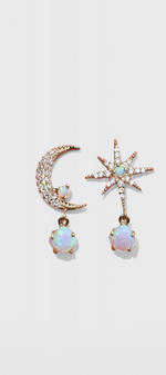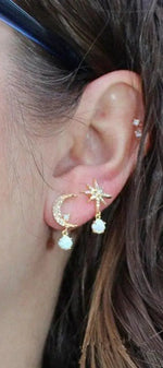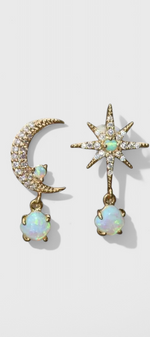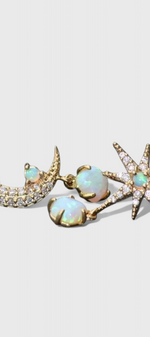 Célestes et enchanteurs, ces boucles d'oreilles en ton doré présentent un délicat design de lune et d'étoile accentué avec des pierres d'opale lumineuses. Parfaitement équilibrées entre la fantaisie et l'élégance, elles apportent un éclat rêveur à votre look, de jour comme de nuit.