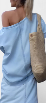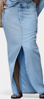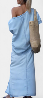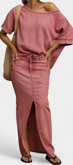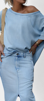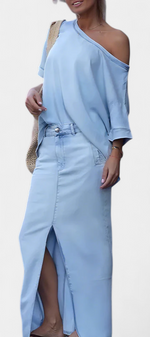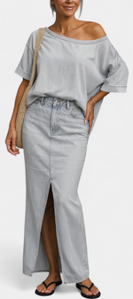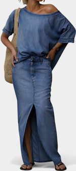Avec attitude et sophistication, l'ensemble Apolonia redéfinit le denim avec une touche moderne et féminine. Son top à une épaule met en valeur la silhouette avec une audace, tandis que la jupe longue avec ouverture frontale allonge la figure et apporte un mouvement raffiné. Confectionné dans un denim doux mais structuré, il équilibre style et confort dans chaque détail.