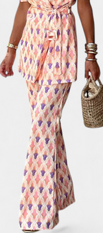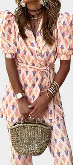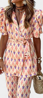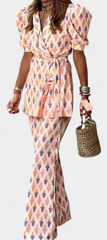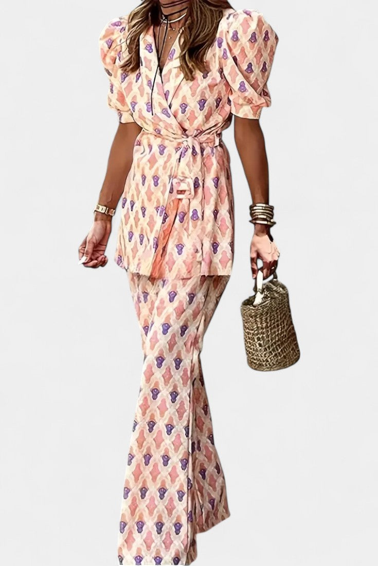 Araceli Ensemble Structuré Imprimé à Manches Bouffantes et Pantalon Évasé