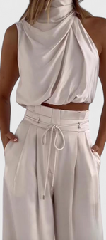 Minimalisme sophistiqué avec une ambiance légère et décontractée. L'ensemble Helira réinvente le confort avec une silhouette épurée et féminine. Son top sans manches avec décolleté structuré et ses pantalons larges plissés créent un équilibre entre fraîcheur, style et liberté de mouvement. Idéal pour ceux qui recherchent un look soigné sans effort.
