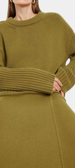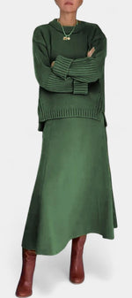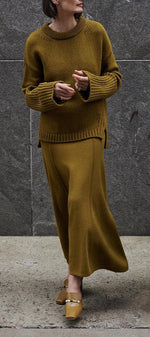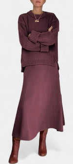 Minimalisme moderne avec une touche accueillante. L'ensemble Patricia combine un pull à col rond haut avec une coupe ample et de délicates finitions en côte, accompagné d'une jupe maxi structurée qui apporte fluidité et définition. Son design monochromatique crée un look harmonieux et polyvalent, parfait pour élever le style quotidien avec sophistication sans effort.