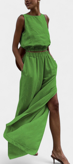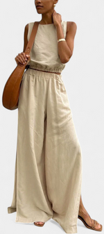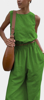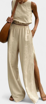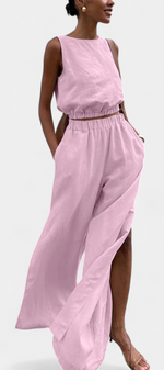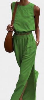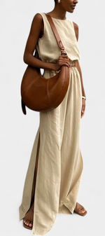 Portia est la définition de l'élégance estivale sans effort. Confectionné dans un mélange léger de coton et de lin, cet ensemble de deux pièces allie lignes épurées et fonctionnalité. Les ouvertures latérales et le design sans manches apportent une touche moderne, tandis que la silhouette ample garantit un confort à chaque pas.