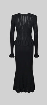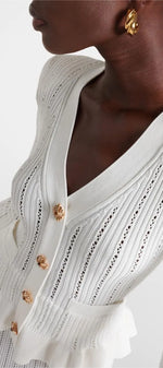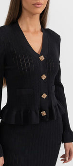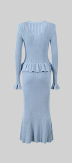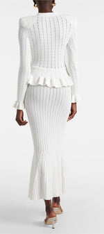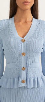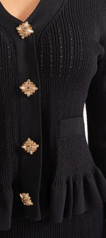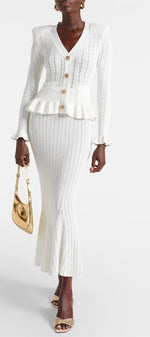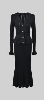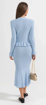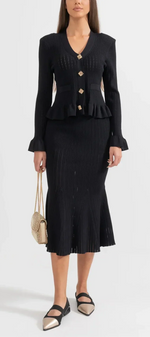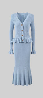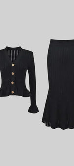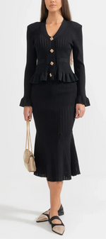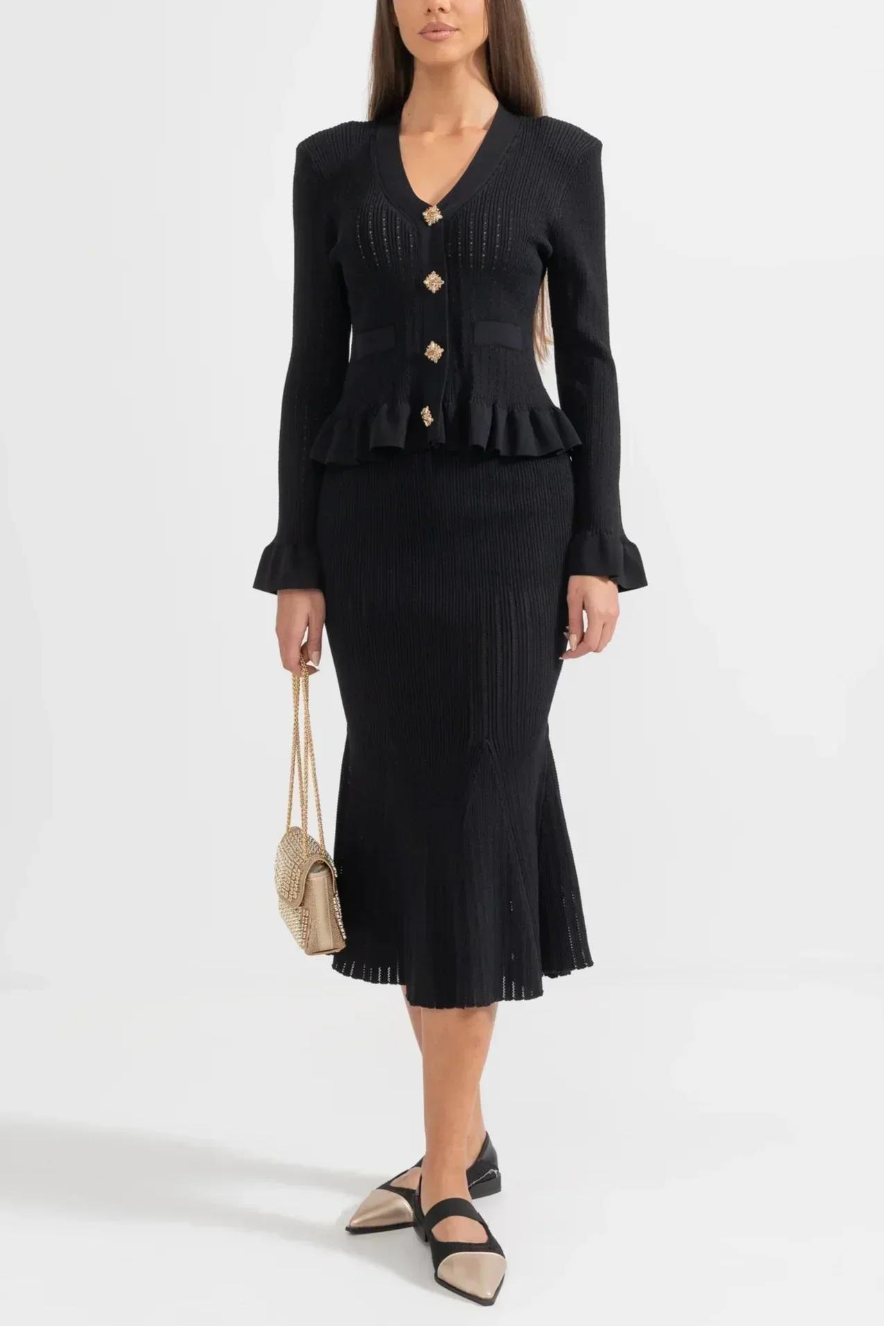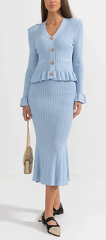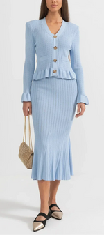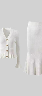 Un ensemble en maille qui allie sophistication et polyvalence à parts égales. Prudence présente un cardigan ajusté avec décolleté en V, de délicates manches à volants et des boutons d'inspiration vintage, accompagné d'une jupe midi taille haute et évasée. Ensemble, ils créent une silhouette fluide et élégante, parfaite pour s'adapter à différents moments de la journée avec un style impeccable.