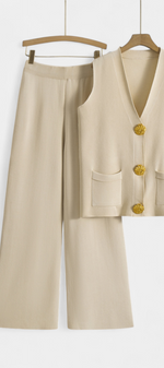 Une proposition raffinée qui allie confort et style intemporel. Jacey se distingue par un gilet en tricot aux lignes classiques et des détails subtils qui rehaussent n'importe quel look. Le pantalon à jambes larges avec taille élastique apporte fluidité et un ajustement flatteur, tandis que ses teintes neutres assurent polyvalence pour différentes occasions.