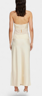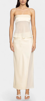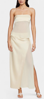 Moderne et romantique, l'ensemble Fjorela combine un top structuré sans bretelles avec une jupe midi asymétrique fluide pour un look d'événement parfaitement équilibré. Avec des contrastes transparents, un drapé en satin et une confection soignée, ce duo en crème offre élégance avec une touche contemporaine.