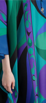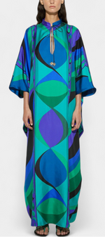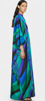 Détendez-vous avec une élégance vibrante. Le kaftan Fiorella présente une silhouette fluide et décontractée qui se déplace avec grâce et liberté. Son imprimé Iride, avec des tourbillons psychédéliques de couleur, transforme chaque pas en une expression artistique de style et d'énergie.