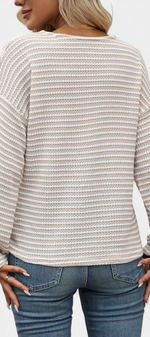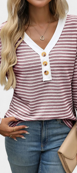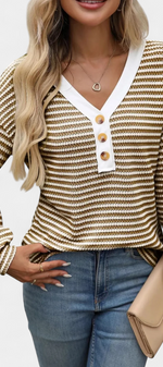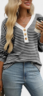Un essentiel polyvalent qui allie confort et style décontracté. Rumer se distingue par sa texture côtelée qui apporte un caractère subtil et un décolleté en V avec des boutons qui met en valeur la silhouette avec modernité. Conçu pour accompagner des looks transitoires, il s'adapte facilement à différentes saisons et combinaisons.