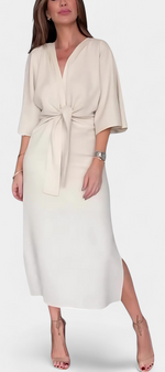 Simplicité qui séduit avec une silhouette pensée pour mettre en valeur naturellement. La robe Ainhoa combine un décolleté en V profond avec des manches kimono et un nœud central qui souligne la taille avec douceur. Son tissu structuré et son design fonctionnel en font un essentiel polyvalent et élégant.