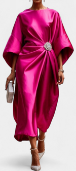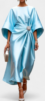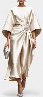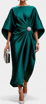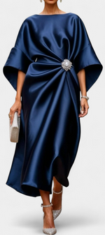 Sophistication à chaque mouvement. La robe Ubelia éblouit par sa finition satinée, sa silhouette élégante en coupe A et ses détails froncés qui rehaussent la silhouette avec subtilité. Son décolleté bateau et ses manches midi apportent un équilibre parfait entre sobriété et féminité.