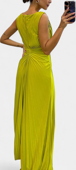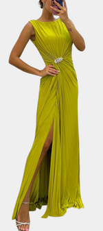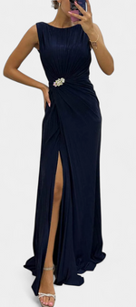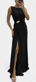 Une fusion impeccable de fluidité, d'élégance et de présence scénique. Shiloh se distingue par sa confection en tissu léger, son plissé méticuleux et sa fente latérale qui accompagne chaque mouvement avec grâce. Le décolleté croisé encadre délicatement la poitrine, tandis que la silhouette fluide allonge la figure avec subtilité et sophistication.