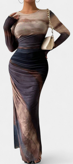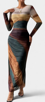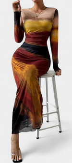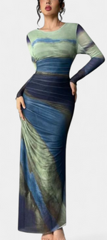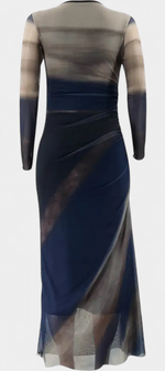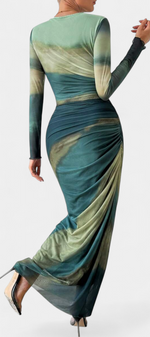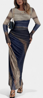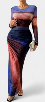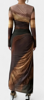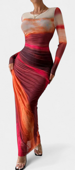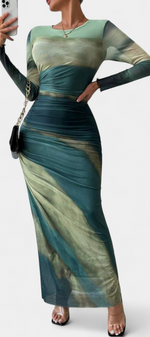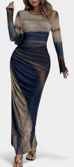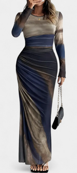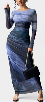 Une proposition sophistiquée qui combine modernité et sensualité. Galene se distingue par sa silhouette ajustée, son col rond classique et ses manches longues qui équilibrent le design. La cape légère apporte un effet éthéré, tandis que l’ourlet asymétrique ajoute du dynamisme et du mouvement, créant un look pensé pour se démarquer lors d'occasions spéciales.