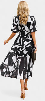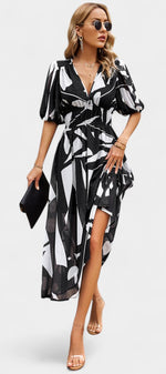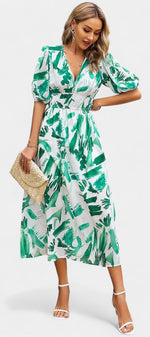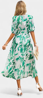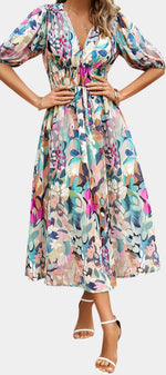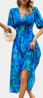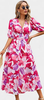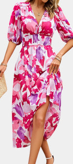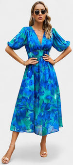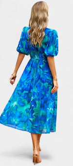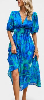 Georgina Robe Midi Florale à Manches Bouffantes et Ourlet Asymétrique