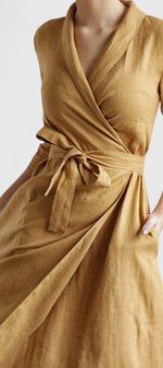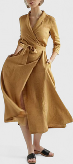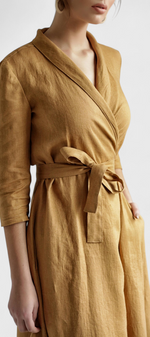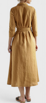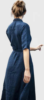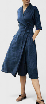 Élégance classique avec une touche intemporelle. La robe Sharon se distingue par son design enveloppant avec col à revers, manches longues et une silhouette midi qui met en valeur la silhouette avec naturel. Confectionnée dans un mélange de coton et de lin, elle offre une sensation légère et structurée parfaite pour la mi-saison.