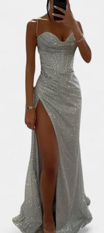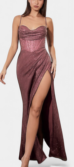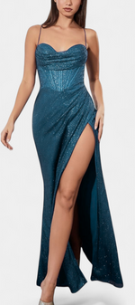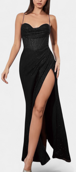 Audacieuse, dramatique et élégante, la robe Armoni est une pièce conçue pour briller lors de toute occasion spéciale. Sa silhouette de sirène ajustée, le corsage style corset et l'ouverture haute sur la cuisse créent un look saisissant qui rehausse avec sophistication. Les bretelles spaghetti et la finition brillante complètent une esthétique moderne et glamour.