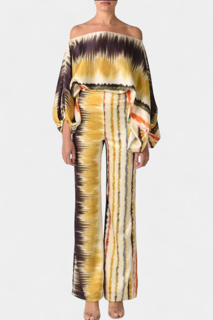 Sybella Ensemble à Haut Épaules Tombantes et Pantalon à Jambes Larges avec Imprimé Artistique