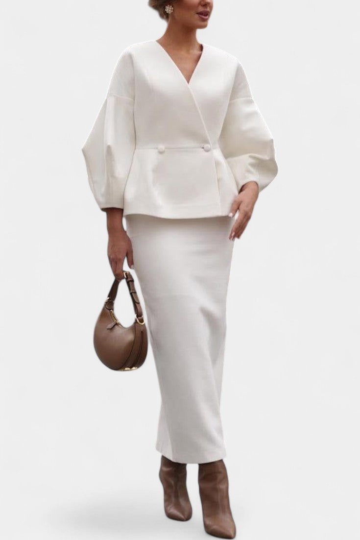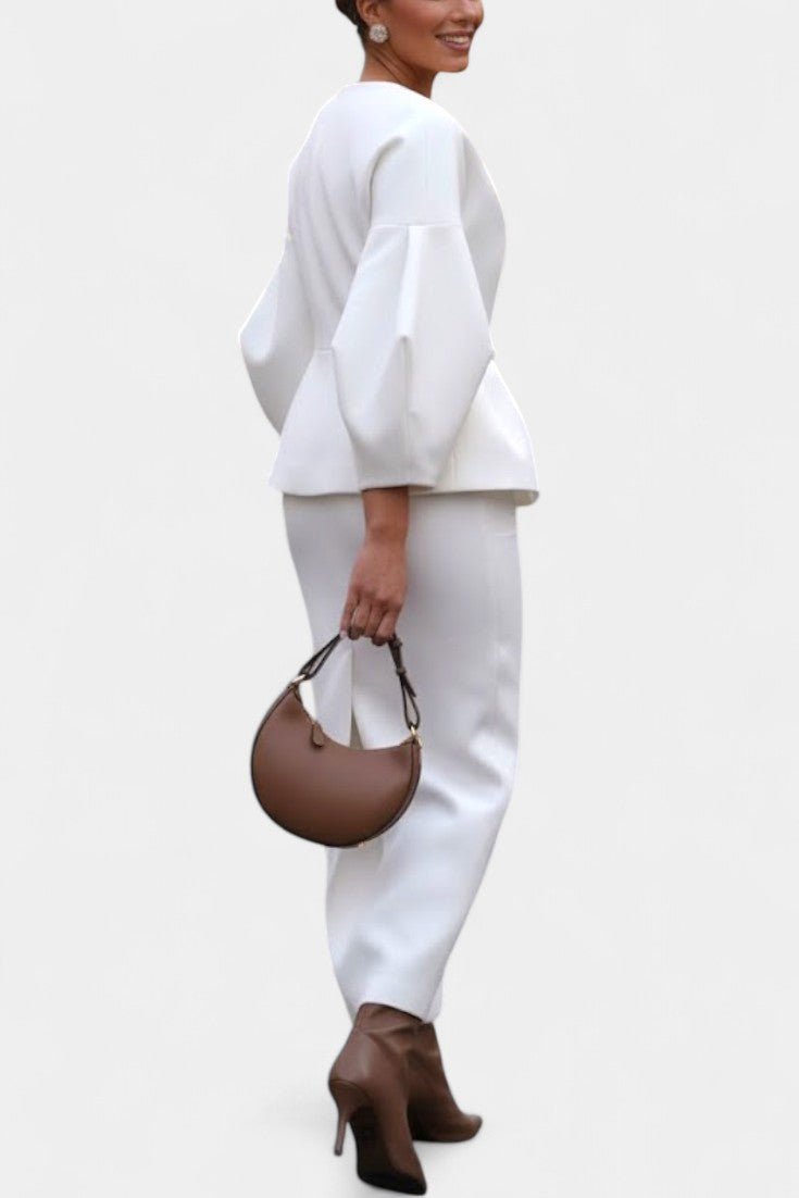 Aliénor Ensemble Tailleur Élégant à Col V et Manches Bouffantes