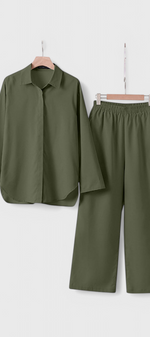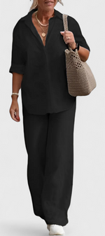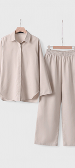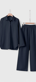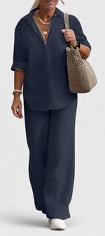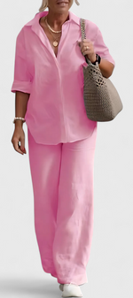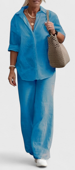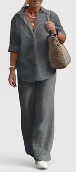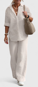 Simplicité raffinée avec une silhouette qui respire la fraîcheur et la naturalité. L'ensemble Skye fusionne une chemise à boutons ample avec un pantalon à taille élastique, tous deux confectionnés dans un mélange léger de coton et de lin. Une combinaison polyvalente qui équilibre confort, style et fonctionnalité pour votre quotidien.