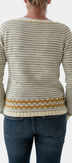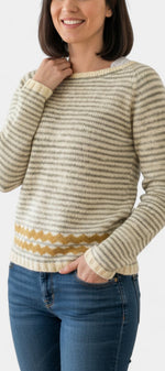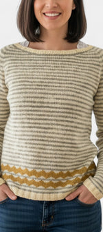 Arlisa capture l’élégance du minimalisme avec une touche rétro subtile. Ce pull en maille douce et légère séduit par ses fines rayures texturées et sa bande contrastée à la base, offrant un jeu de lignes moderne et délicat. Sa coupe droite et son col rond en font un essentiel raffiné, idéal pour les journées fraîches.