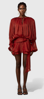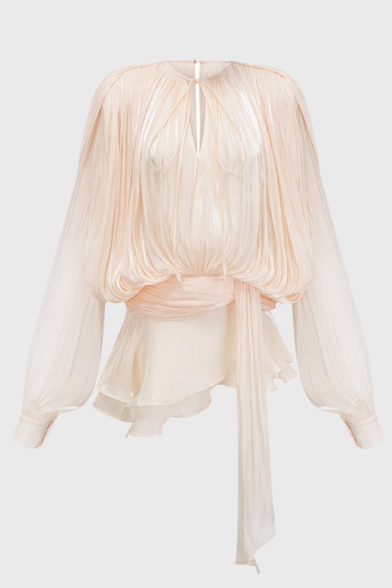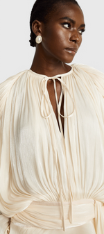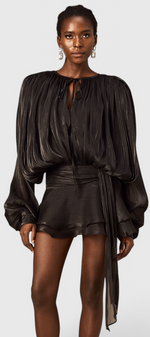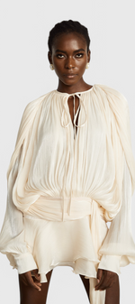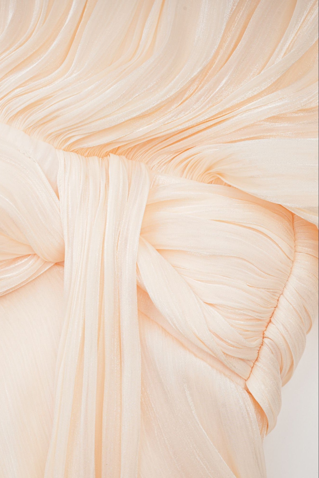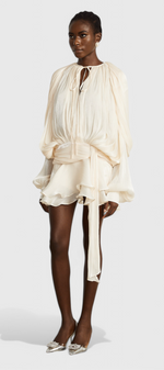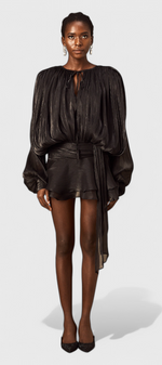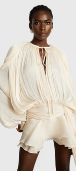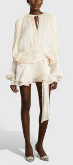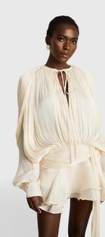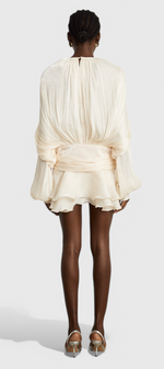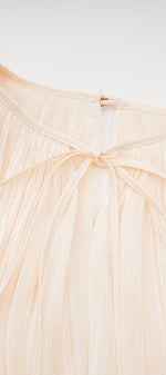 L'élégance moderne rencontre une texture ludique dans cette robe mini saisissante. Conçue dans une teinte neutre douce, elle présente un tissu entièrement plissé, un détail de torsion flatteur et de délicats accents scintillants qui capturent la lumière. La silhouette drapée est accentuée par des épaulettes pour plus de structure, tandis que les ourlets à volants ajoutent une touche féminine. Parfaite pour les événements nocturnes ou les occasions spéciales.