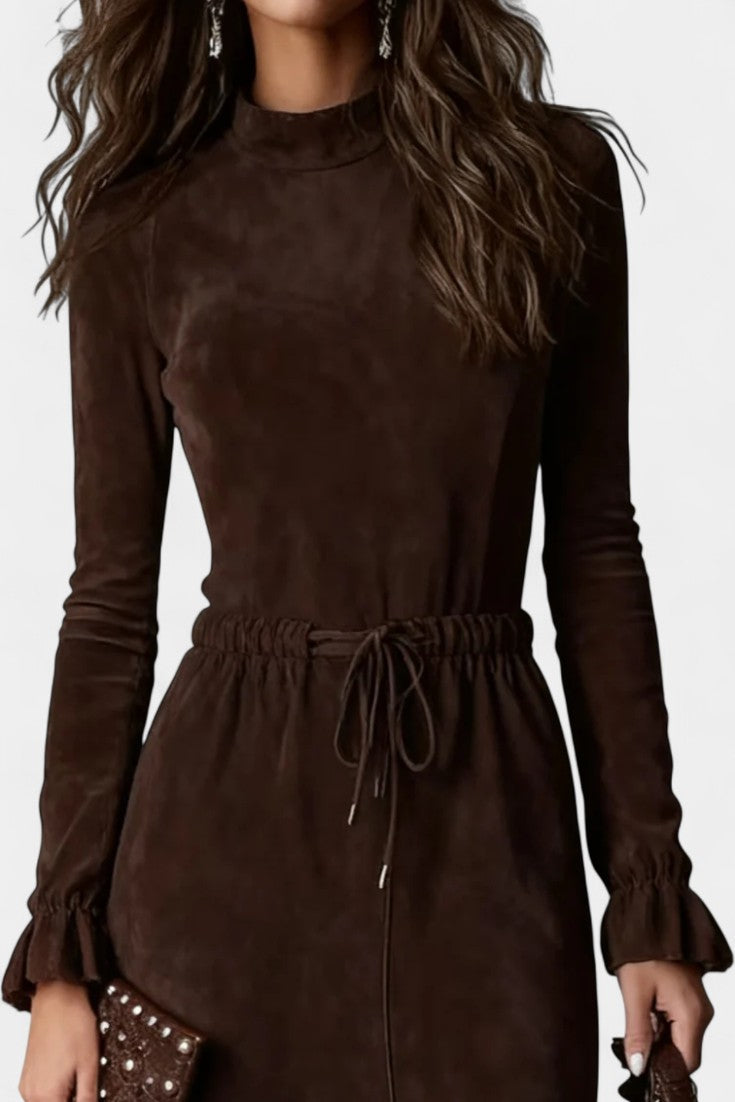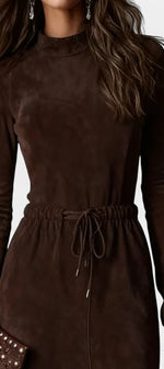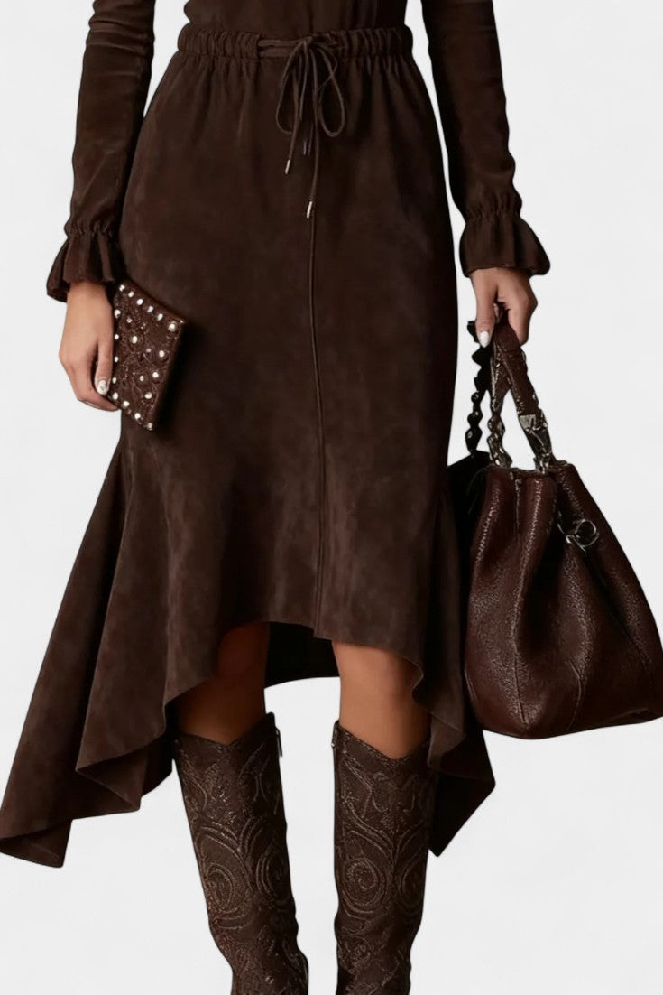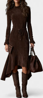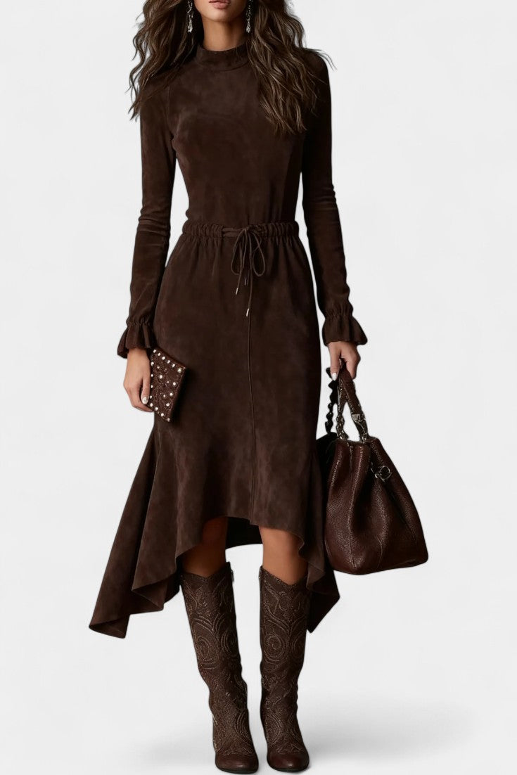 Laureline Robe Midi Irrégulière en Suède Brun Foncé avec Cordon de Serrage