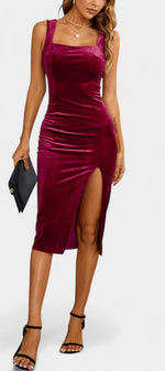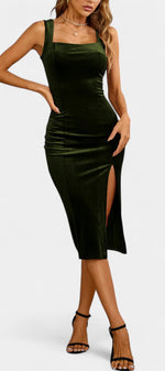 Une pièce sensuelle et intemporelle qui sublime la silhouette avec raffinement. La robe Marine, confectionnée dans un velours doux et lumineux, épouse le corps avec élégance. Son col carré et ses fines bretelles créent un équilibre parfait entre modernité et féminité, tandis que la fente latérale ajoute une touche de séduction subtile.