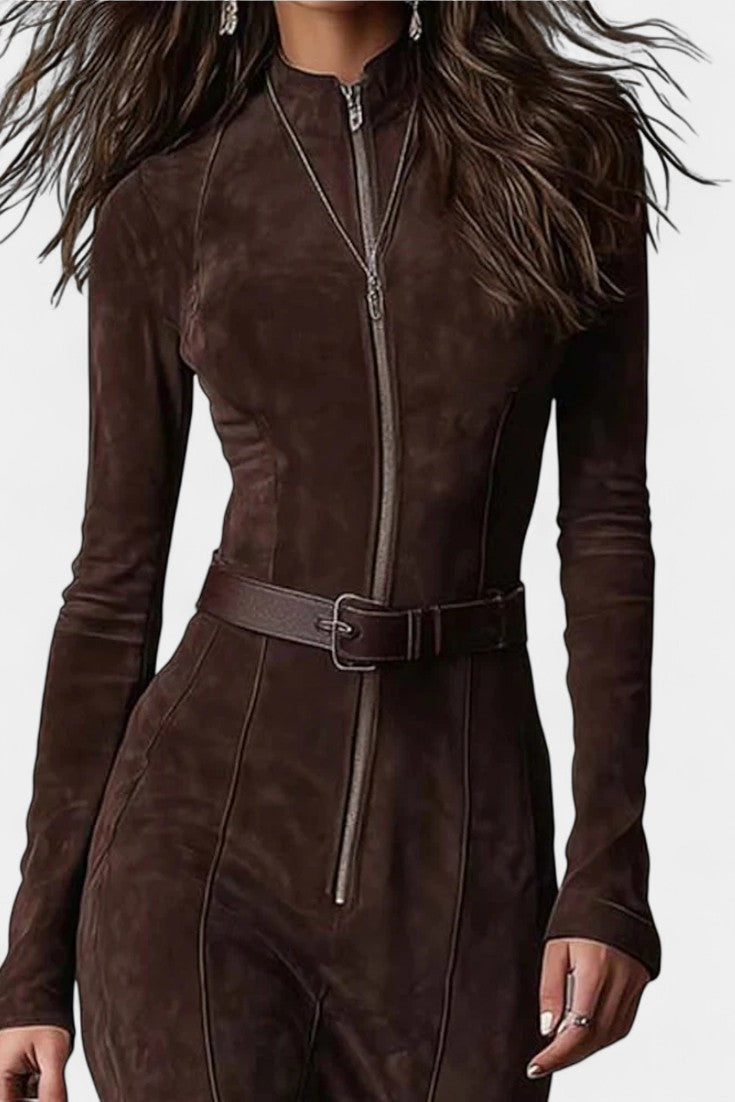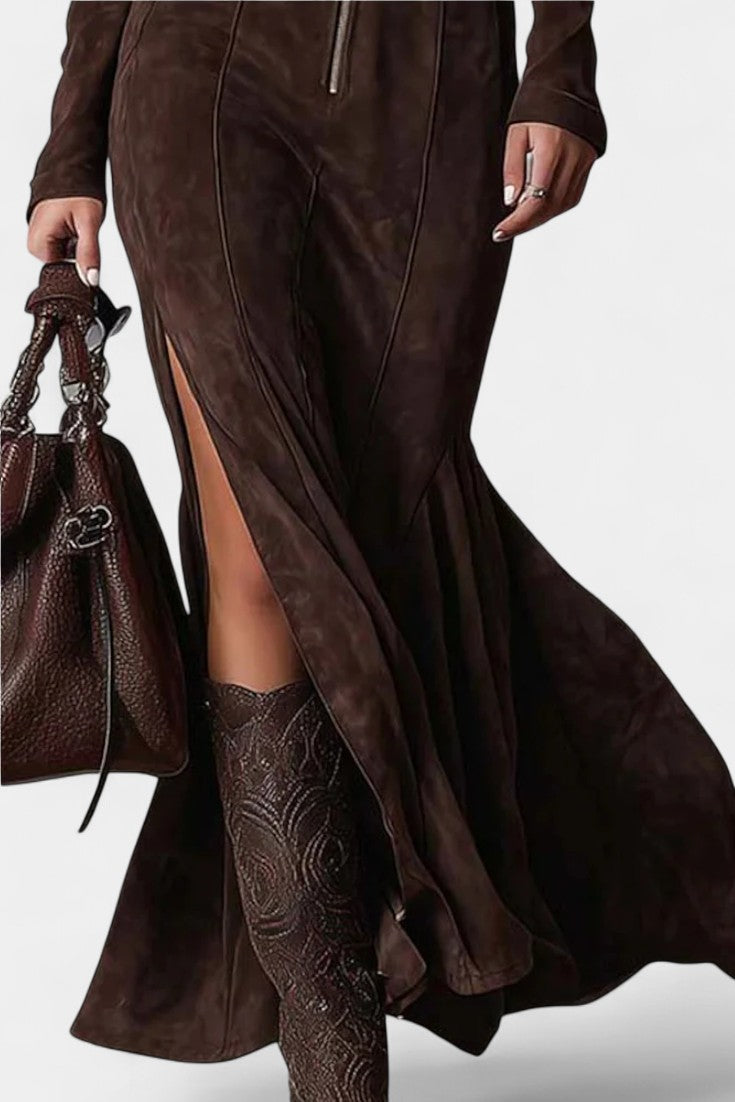 Perrine revisite le style vintage avec une touche de modernité raffinée. Confectionnée dans un suède synthétique au toucher velouté, cette robe maxi séduit par sa fermeture éclair avant et sa taille ceinturée qui structure la silhouette avec élégance. Sa jupe fluide et fendue ajoute du mouvement et une note sensuelle, parfaite pour affirmer une allure à la fois féminine et contemporaine.
