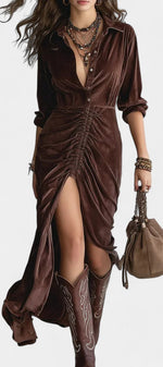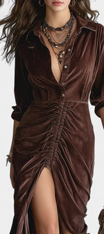 Quitterie Robe Midi en Velours Plissé avec Boutons Vintage
