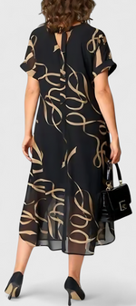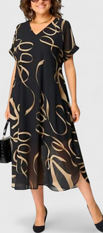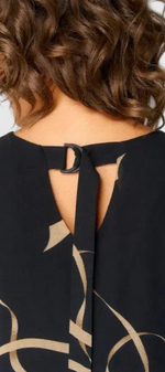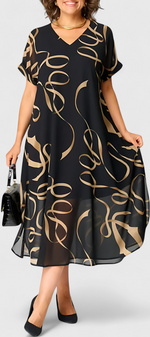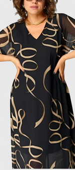 Un luxe décontracté avec une touche artistique pour un look qui éblouit sans effort. La robe Allegra combine un imprimé abstrait dans des tons dorés et beiges sur fond noir avec une silhouette ample et fluide. Son décolleté en V et ses manches courtes ajoutent une élégance naturelle, tandis que le tissu doux garantit un confort tout au long de la journée.