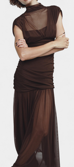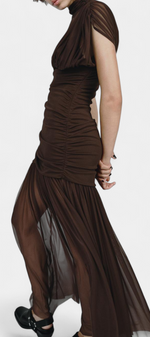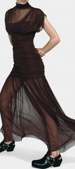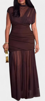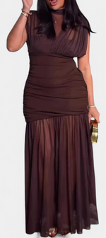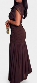 Une robe maxi en marron chaud, parfaite pour des dîners, des soirées spéciales ou toute occasion où vous souhaitez vous démarquer avec une élégance discrète.