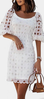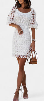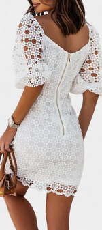 Fraîcheur méditerranéenne avec une touche coquette et charmante. Cette robe ajustée en dentelle florale célèbre la silhouette avec élégance tandis que les manches bouffantes et le décolleté en cœur rehaussent le style d'une touche romantique et actuelle.