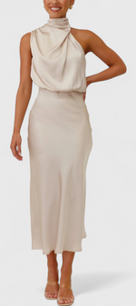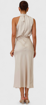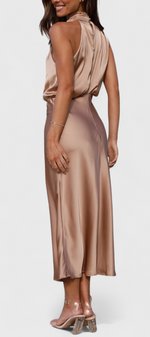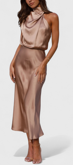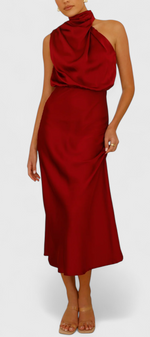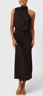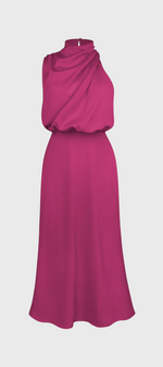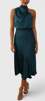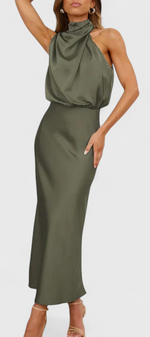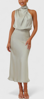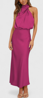 Sophistication intemporelle avec une touche moderne, la robe Rina séduit par sa silhouette élancée et son décolleté halter drapé qui attire tous les regards. Son design sans manches et sa chute fluide en font le choix idéal pour des événements spéciaux où l'élégance discrète fait la différence.