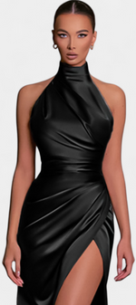 Moderne et sophistiquée, la robe Symone se distingue par son design sculptural et son élégance fluide. Avec un décolleté halter torsadé, une taille cintrée et une jupe longue avec fente latérale, elle offre une silhouette saisissante avec un mouvement enveloppant qui attire tous les regards.