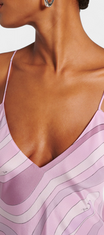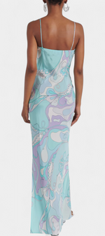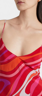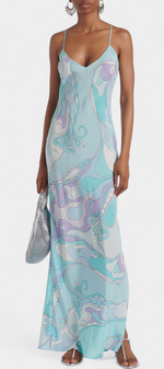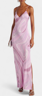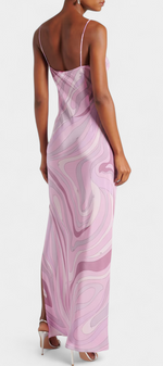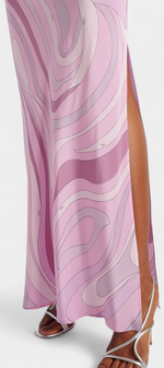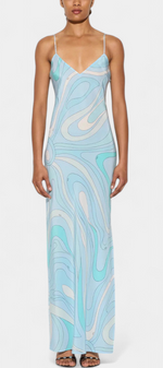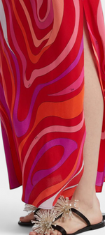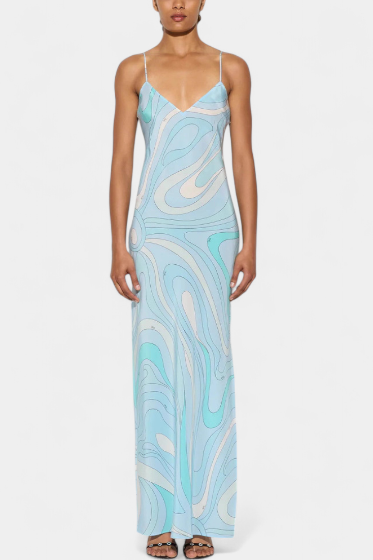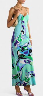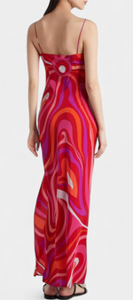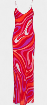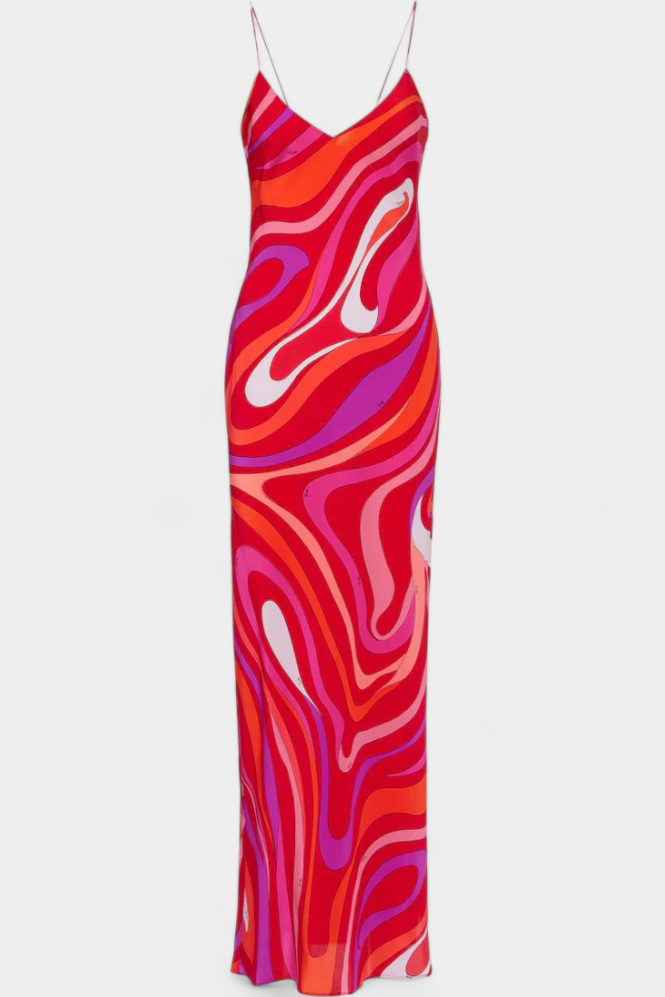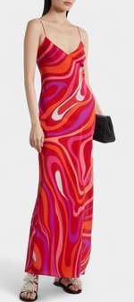 Un design audacieux qui transmet mouvement et énergie. La robe Valera se distingue par un imprimé tourbillon rétro-psychédélique dans des tons vibrants, fusionnant style artistique avec une silhouette fluide et féminine. Sa coupe sans manches apporte de la fraîcheur, tandis que le tissu brillant accentue l'intensité du design et la longue jupe accompagne chaque pas avec un dynamisme élégant.