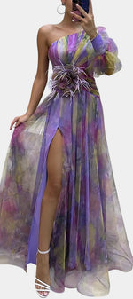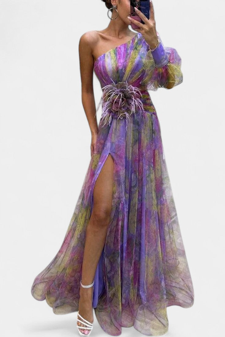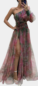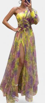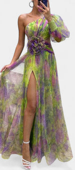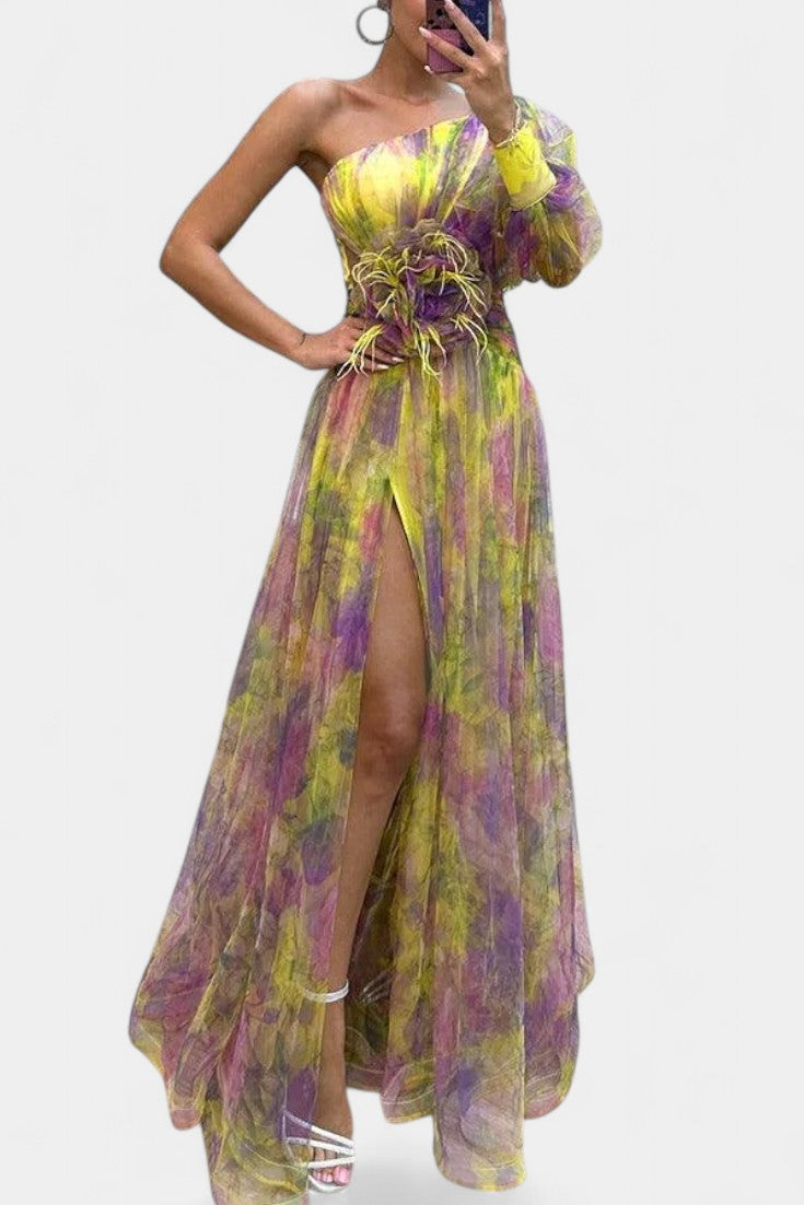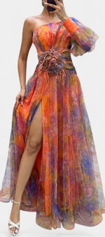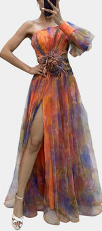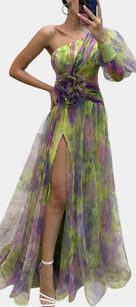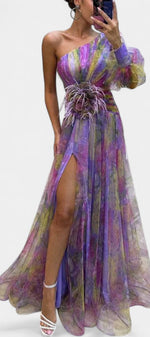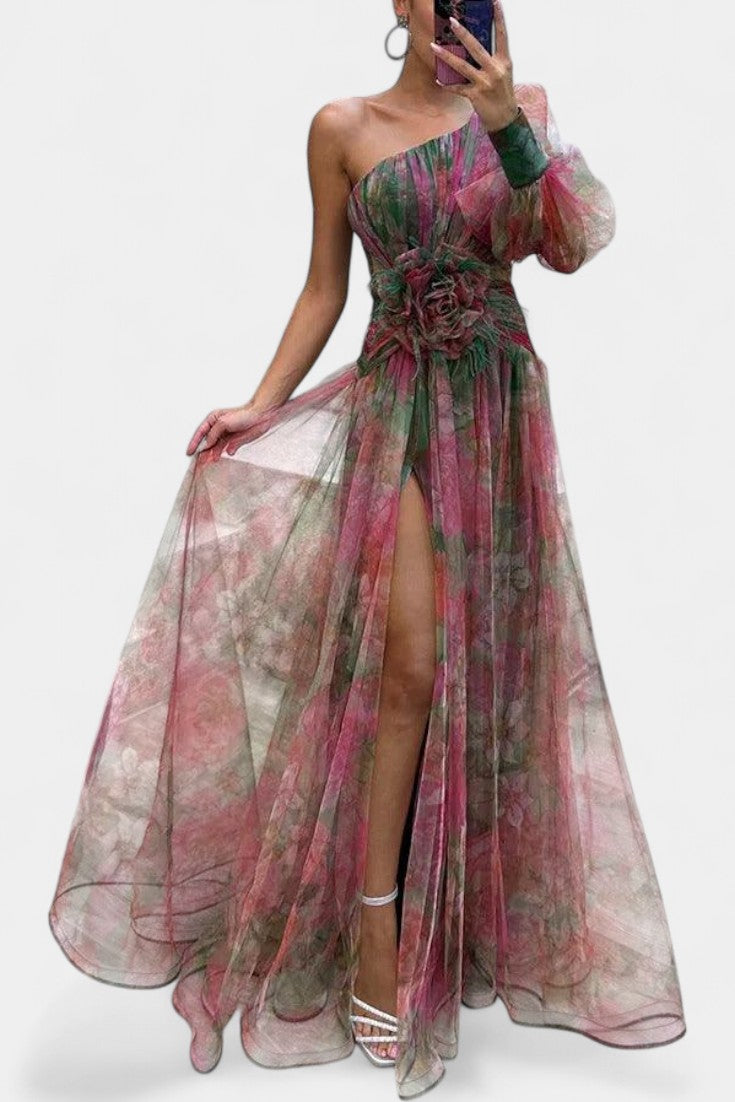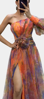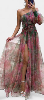 Une déclaration de style pour des événements qui exigent une présence. La robe Amelie combine un design sculptural avec des détails éthérés, de son décolleté asymétrique à la jupe drapée avec une fente avant. L'imprimé aquarelle et l'appliqué floral à la taille élèvent son élégance, créant une silhouette inoubliable pour des célébrations sophistiquées.