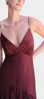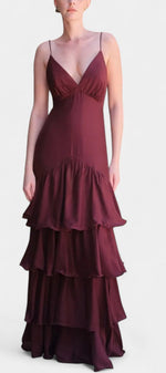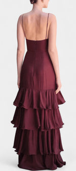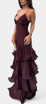 Un design élégant qui irradie une sophistication intemporelle. Atlana éblouit avec son profond ton bordeaux et ses délicates bretelles fines qui encadrent subtilement les épaules. Les volants en cascade ajoutent un mouvement fluide à la silhouette, tandis que la longueur maxi allonge avec grâce, en faisant une pièce parfaite pour des moments mémorables.