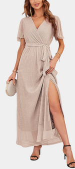 Plongez dans l'élégance raffinée avec Esperanza : une robe maxi de style enveloppant conçue pour mettre en valeur chaque courbe. Avec son décolleté en V élégant, ses douces manches volantes et un nœud qui définit la taille, ce vêtement allie féminité intemporelle et confort tout au long de la journée. Que ce soit pour des mariages, des fêtes dans le jardin ou des promenades au soleil, Esperanza est faite pour bouger avec vous.