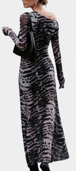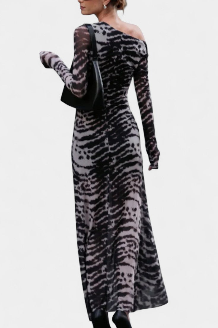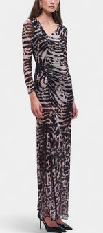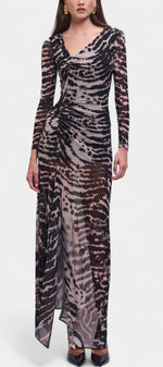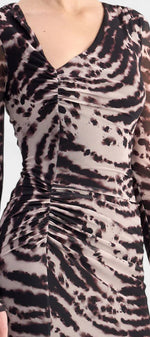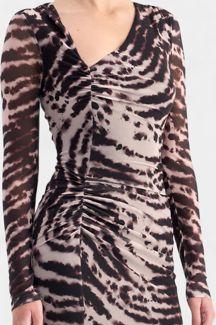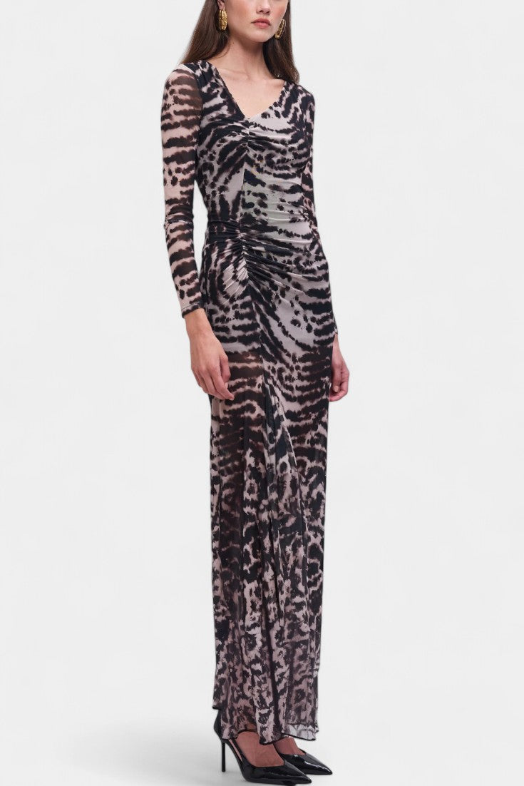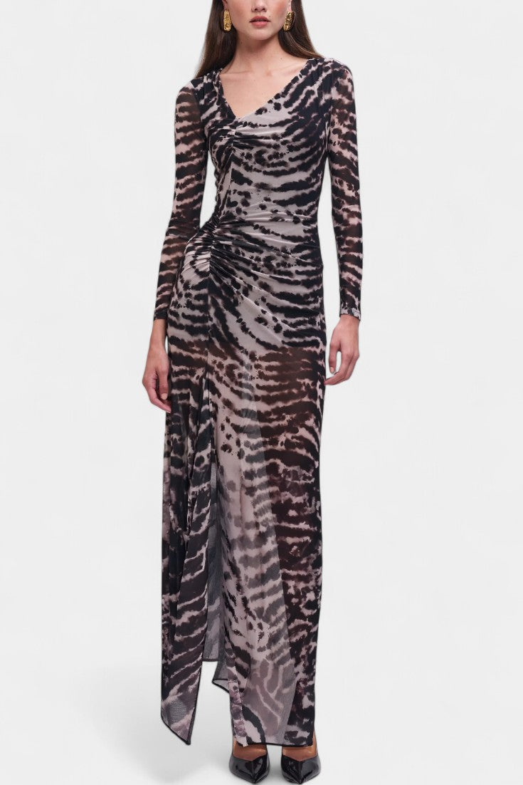 Audacieuse et sophistiquée, la robe Isalie capture la force de l'imprimé animal dans une silhouette élégante et enveloppante. Son design cintré avec des fronces stratégiques met en valeur la silhouette, tandis que la transparence subtile de la jupe apporte une légèreté et un charme magnétique.