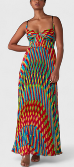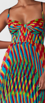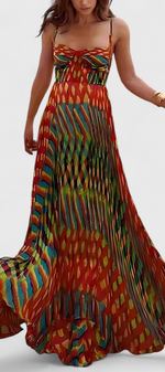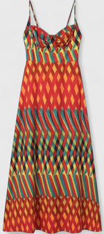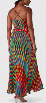 Une œuvre d'art en mouvement. La robe Janis fusionne un imprimé géométrique peint à la main avec une silhouette fluide en A-line pour un effet captivant. Son décolleté halter en forme de coeur et ses détails froncés à la taille ajoutent une définition féminine et une touche de sophistication raffinée.