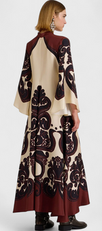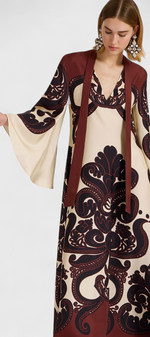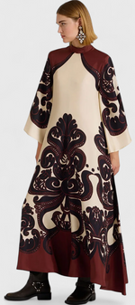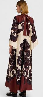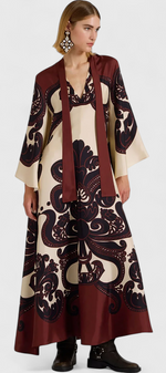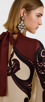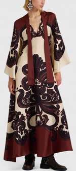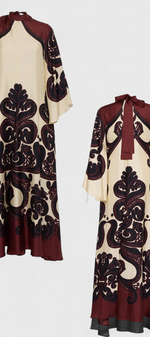 Fluidité artistique avec un design qui impose l'élégance. La robe Maritza se distingue par sa silhouette enveloppante, son col haut avec lien à l'arrière et un délicat imprimé de grenadille, créant une esthétique sophistiquée et assurée. Idéale pour les moments où le style devient protagoniste.