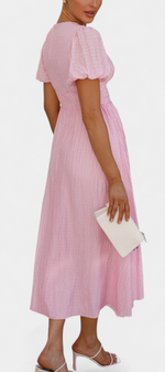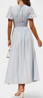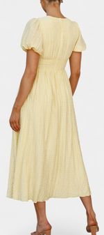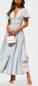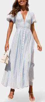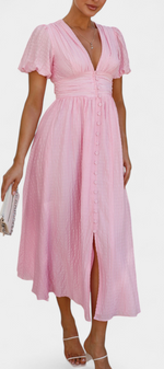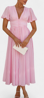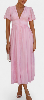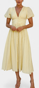 Subtilité romantique avec une touche estivale irrésistible. La robe Mélia combine un décolleté en V profond, des manches bouffantes et une jupe fluide avec une fente plissée qui se déplace avec grâce. La ceinture ajustable à la taille définit la silhouette avec délicatesse, tandis que les boutons sur le devant apportent polyvalence et détail visuel.