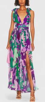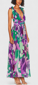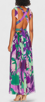 Fluide, vibrant et plein de caractère. La robe Cecil combine un imprimé artistique dans des tons de lilas et de verts avec une silhouette légère et ouverte qui se déplace avec élégance. Son décolleté prononcé, son dos nu et ses détails plissés en font une pièce maîtresse pour des événements, des vacances ou des soirées spéciales en plein air.