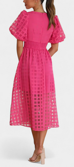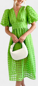 Marigold Robe Midi à Manches Bouffantes et Motif à Carreaux