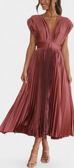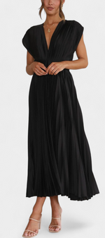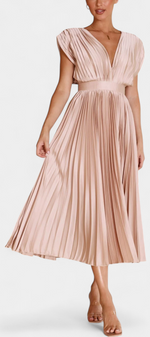 Élégance classique avec une touche moderne—la robe Mireia séduit par son décolleté en V drapé, sa taille haute et sa jupe fluide à plis qui se déplace avec grâce. Conçue pour offrir une coupe flatteuse et un confort léger, elle est parfaite pour toute occasion nécessitant un style sans effort.