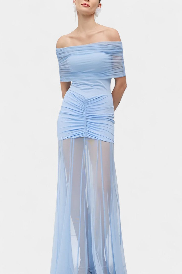 Mariste Robe Off-Shoulder Fendue en Tissu Soyeux Élastique